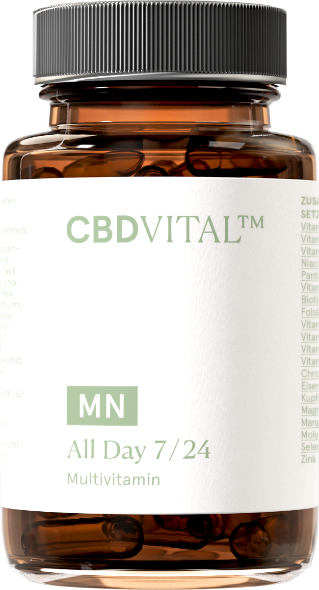 All Day 7/24 von CBD VITALTM versorgt sie mit wichtigen Mikronährstoffen. All Day 7/24 ist die Basisversorgung, welche perfekt auf unsere heutigen Lebensgewohnheiten abgestimmt ist. Zusätzlich unterstützt das innovative Multivitamin die Deckung eines erhöhten Mikronährstoffmehrbedarfs.